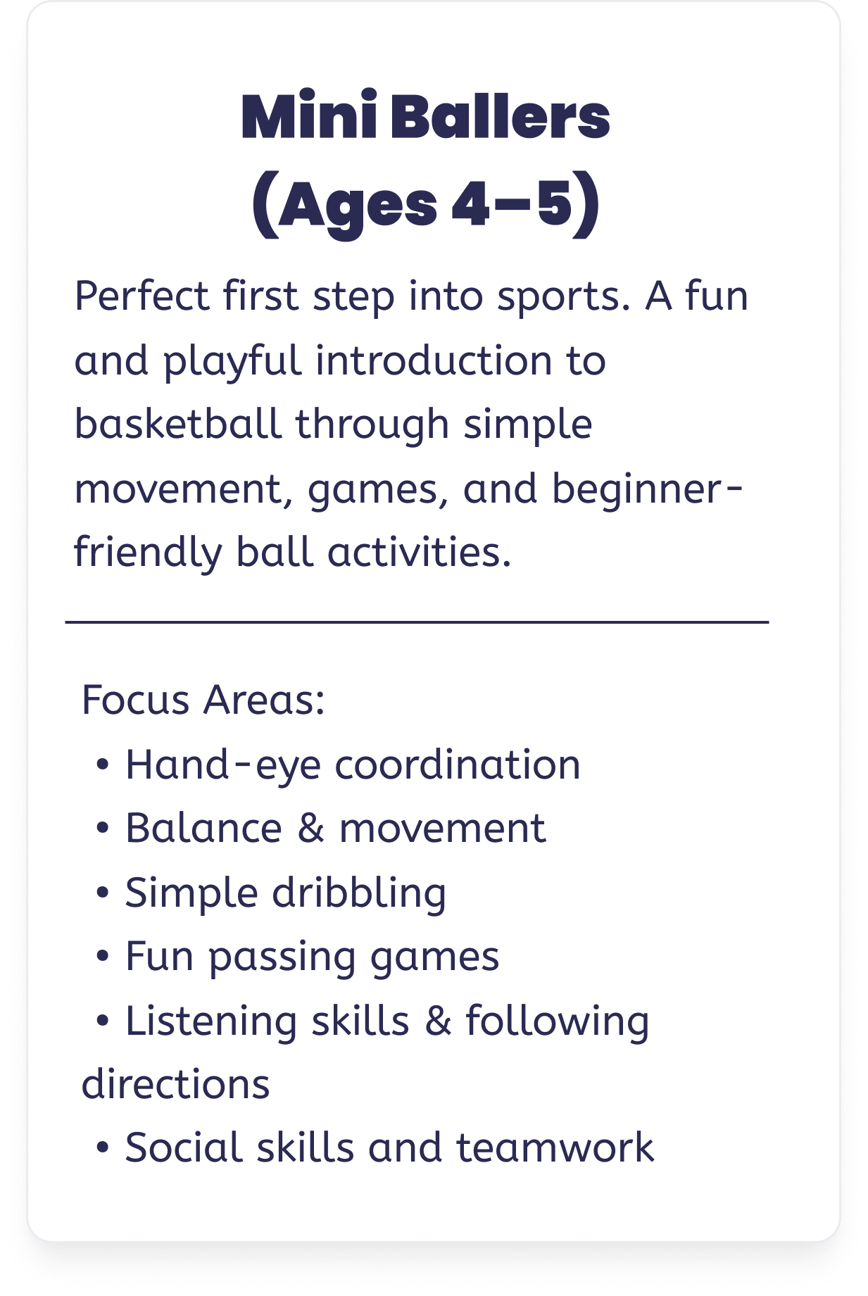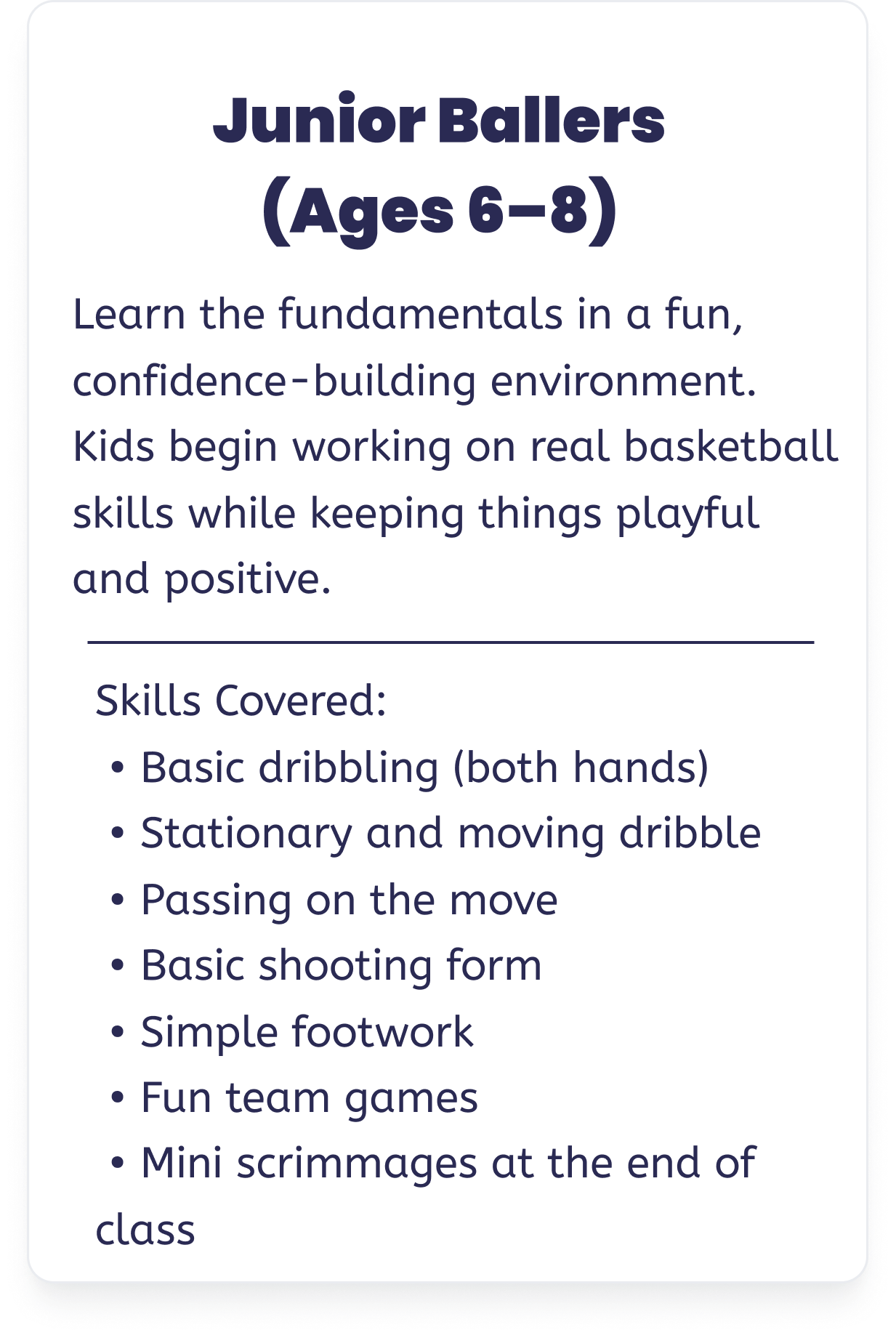 Who Our Programs Are For Class Length: 45 minutes Group Size: 8–10 kids Experience Needed: None Class Length: 60 minutesGroup Size: 10–12 kidsExperience Needed: None Class Length: 60 minutesGroup Size: 10–14 kidsExperience Needed: None or beginner